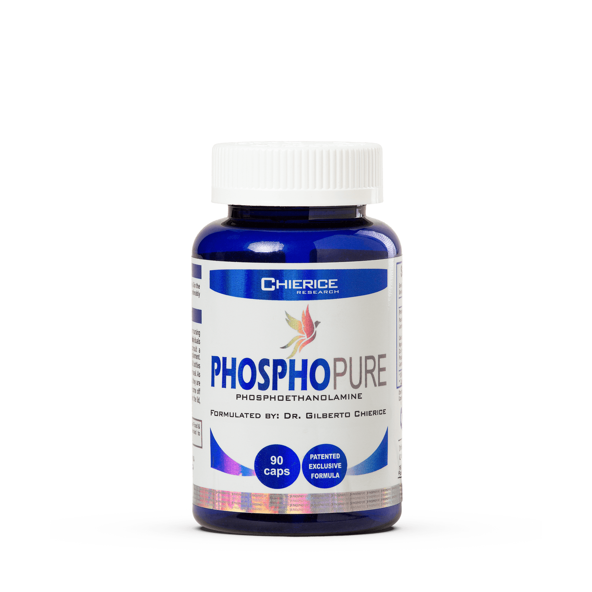 A specially formulated supplement with the synthetic bioidentical version of phosphoethanolamine, a compound naturally present in the body that contributes to the health of cell membranes. Manufactured in the United States under patented processes, Phosphopure is developed exclusively at Chierice Research, being the only bioidentical created by Prof. Dr. Gilberto Chierice. This product is designed to promote overall well-being by supporting optimal cellular function. Intended for daily use, it provides a consistent and reliable dosage in every capsule. Packaged in a bottle with 90 easy-to-swallow capsules, Phosphopure combines purity, convenience, and scientific precision for your wellness routine.